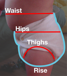 Measure your baby with diaper or underwear that will be used most often with the soaker or pants. If you don't have a measuring tape, use a ribbon and mark off measurement points then measure between the marks with a ruler. | |